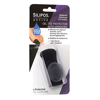 The Silipos Active Gel Toe Protector with Spreader is a combination of two products in one. The toe protector relieves pressure and friction. The spreader helps to separate toes reducing pain.